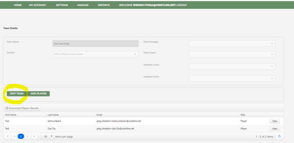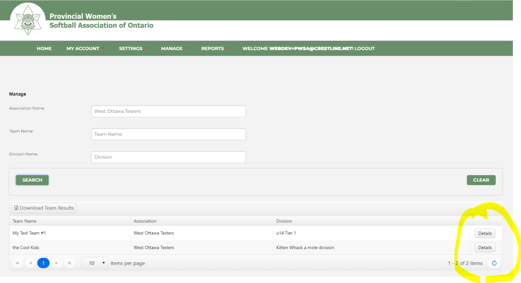 Menu – Manage / Teams view. Select an Association (West Ottawa Testers) and search the results should only show teams that are connected to that Association. Select one of the teams and click on Details to view the team information page.