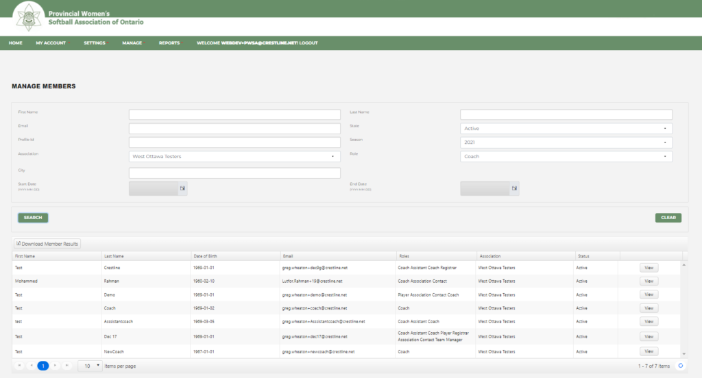 When Searching members and looking for individuals who belong to a specific Association and have the role of Coach and or Assistant coach. The below example is using the “West Ottawa Testers” association and looking for users with the Coach Role.